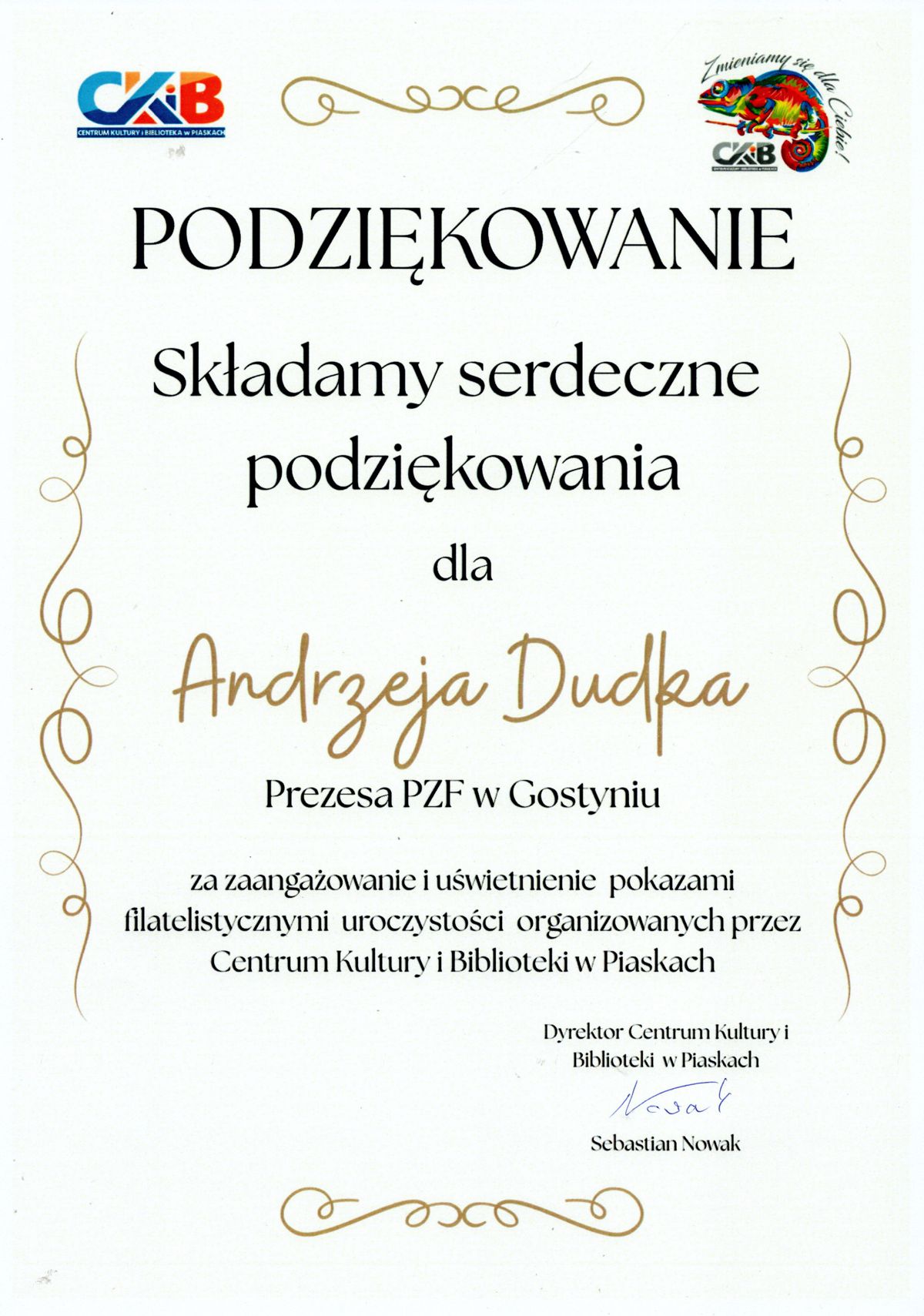12 grudnia 2025 roku w Centrum Kultury i Biblioteki w Piaskach odbyły się uroczyste obchody 100-lecia powstania miejscowej biblioteki. Imprezą towarzyszącą był pokaz filatelistyczny „Literatura na znaczkach pocztowych” przygotowany przez Andrzeja Dudka i Michała Pohla – członków Koła Polskiego Związku Filatelistów im. Wacława Boratyńskiego w Gostyniu. Na 64 kartach wystawowych przedstawiono walory pocztowe, na których pokazano historię książki od Biblii, druku, po czasy współczesne. Zaprezentowano też polskich laureatów Nagrody Nobla w dziedzinie literatury wydanych przez Pocztę Polską: Henryka Sienkiewicza (1905), Władysława Reymonta (1924), Czesława Miłosza (1980), Wisławę Szymborską (1996). Poczta Polska nie wydała żadnego waloru poświęconego Oldze Tokarczuk (2019 za rok 2018). Na pokazie zaprezentowano za to całostkę poświęconą polskiej noblistce wydaną przez Pocztę Chin. Łącznie na kartach wystawowych znalazło się ponad 50 sylwetek pisarek i pisarzy. Dyrektor Centrum Kultury i Biblioteki w Piaskach Sebastian Nowak uroczyście podziękował Andrzejowi Dudkowi i Michałowi Pohlowi za przygotowanie ekspozycji. Wręczył też drobne upominki. Andrzej Dudek w kilku słowach opisał walory zaprezentowane w gablotach. Poinformował zebranych, że to trzeci pokaz zorganizowany w tym roku przez gostyńskich filatelistów w Piaskach.