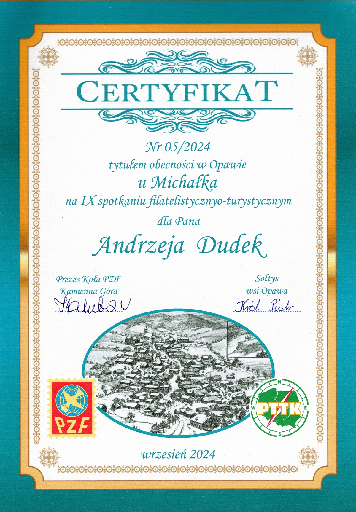 Podsumowanie pobytu nastąpiło w sobotnie popołudnie, 7 września. Andrzej Dudek przedstawił eksponat w budowie pt. „Dudek”. Chwilowo to cztery ekrany. Następnie wręczyliśmy naszym gospodarzom okolicznościowy obraz. Hans Joachim Kuhnert z kolei przekazał zasponsorowane przez siebie okolicznościowe certyfikaty podpisane przez Wacława Kalutę — prezesa Koła PZF w Kamiennej Górze oraz Piotra Króla — sołtysa wsi Opawa. Wszyscy uczestnicy wycieczki otrzymali upominki ofiarowane przez Starostwo Powiatowe w Kamiennej Górze.
