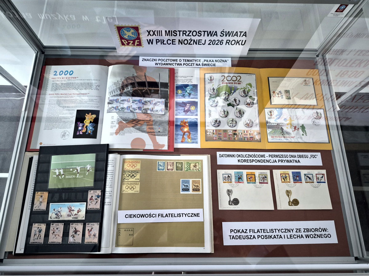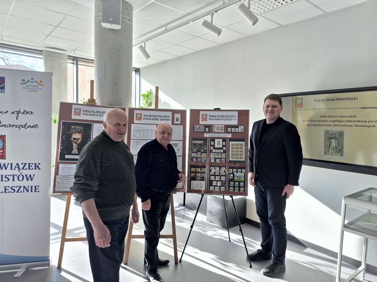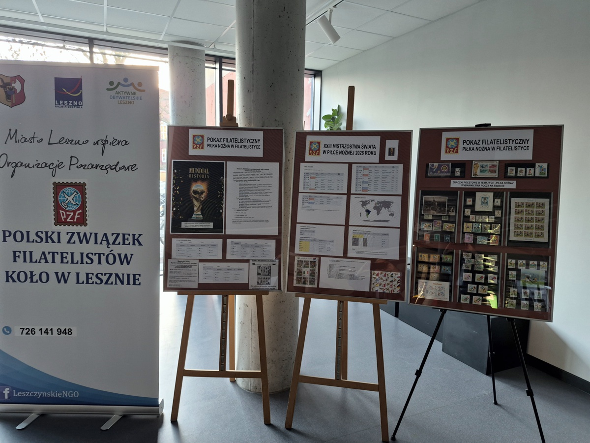 Koło Miejskie PZF w Lesznie w okresie od 9 kwietnia do 31 sierpnia 2026 roku w siedzibie Miejskiej Bibliotece Publicznej im St. Grochowiaka zorganizowało kolejny pokaz filatelistyczny pt. „Piłka nożna w filatelistyce. Historia mistrzostw świata” ze zbiorów kol. kol. Tadeusza Posikaty i Lecha Woźnego.