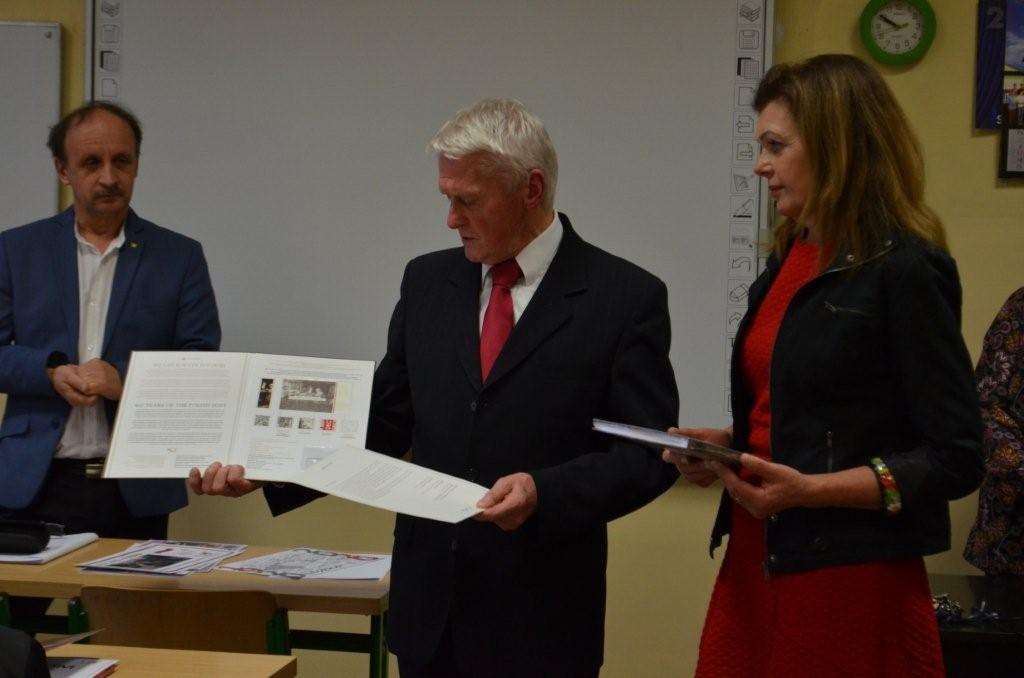 Od lewej: Tadeusz Nawrocki, Ewa SpĹ‚awska-Ĺakoma, nauczycielka ZSET, Lech WoĹşny, MikoĹ‚aj Jakubowski, Robert Syc, dyrektor ZSET i SĹ‚awomir TomkĂłw