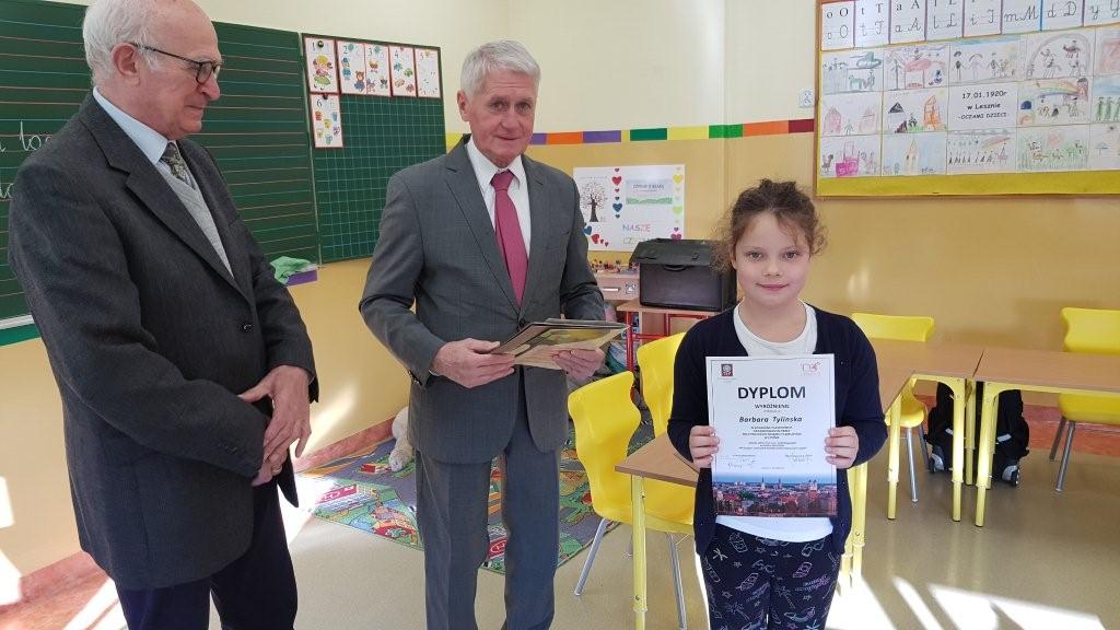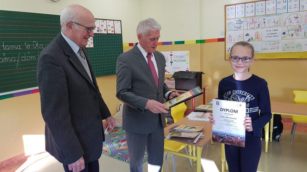Od lewej: Tadeusz Nawrocki, członek komisji konkursowej, Lech Woźny i Julia Machowska, uczennica kl. I Szkoły Podstawowej nr 2 w Lesznie