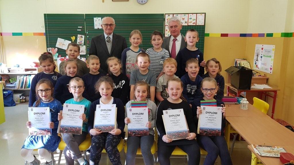 Uczniowie klasy I Szkoły Podstawowej nr 2 w Lesznie wyróżnieni w konkursie wraz z koleżankami i kolegami z klasy, wychowawczynią Anną Sterną i przedstawicielami Koła PZF w Lesznie